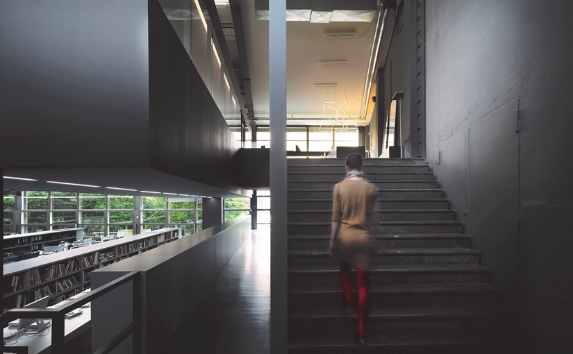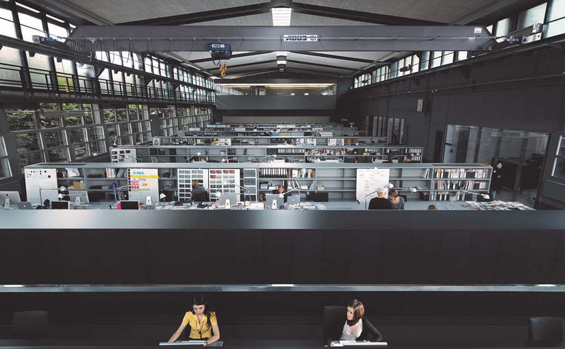 Die Medienbrücke im Bürogebäude von KMS TEAM / KMS BLACKSPACE München überspannt die gesamte Breite der ehemaligen Industriehalle. Gelagert ist die freitragende Stahl / Glas Konstruktion auf zwei Säulen und kann über eine Treppe am einen Ende oder über einen Steg vom anderen Ende des Gebäudes erreicht werden.