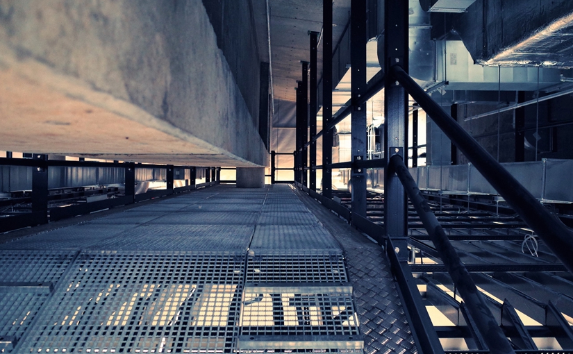 Siebzehn abgehängte Wartungsstege zur Inspektion der Schwimmhallentribünen. Wartungspodeste werden per Hand verfahren. Rauchschürzen fangen Rauch und Brandgase ein. Verkleidung der Schwimmhallenwände.