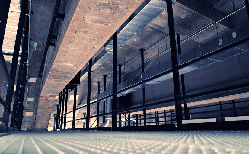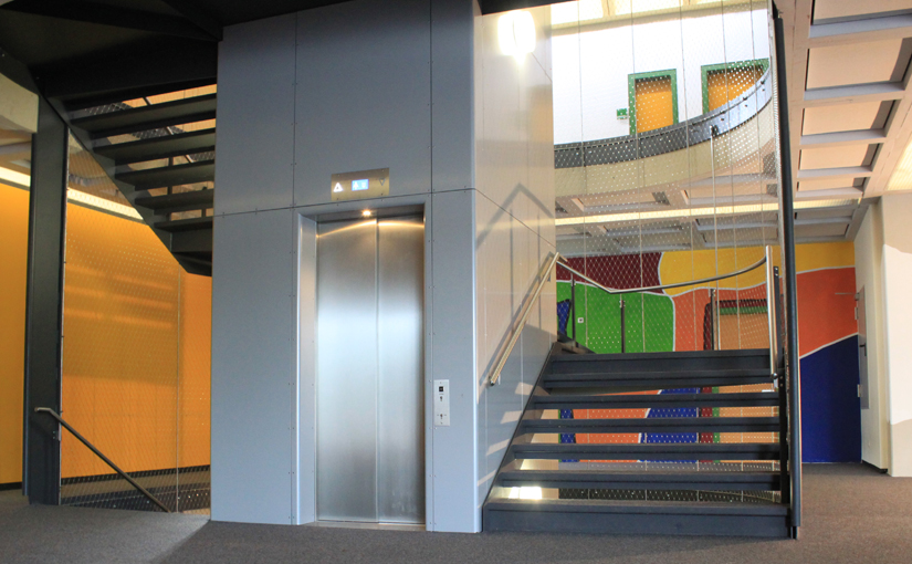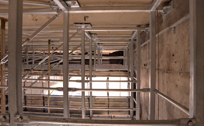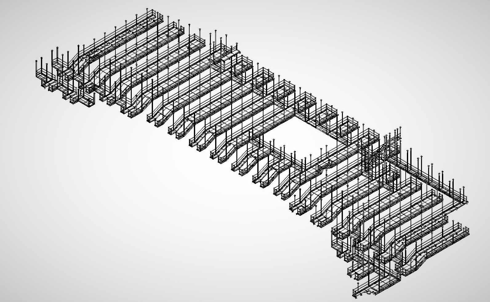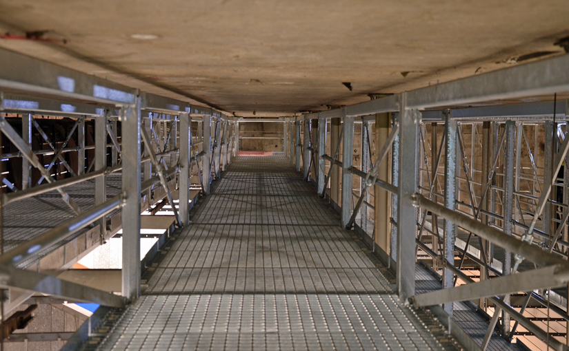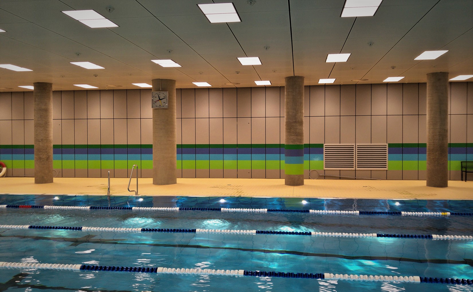 Siebzehn abgehängte Wartungsstege zur Inspektion der Schwimmhallentribünen. Wartungspodeste werden per Hand verfahren. Rauchschürzen fangen Rauch und Brandgase ein. Verkleidung der Schwimmhallenwände.