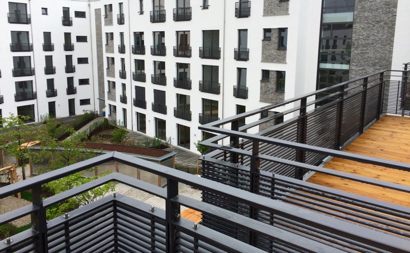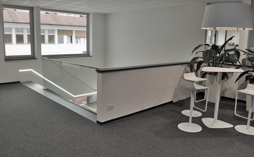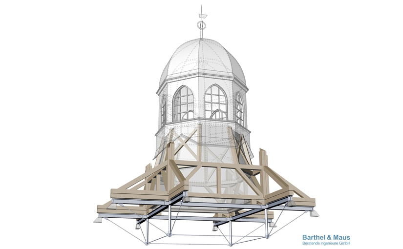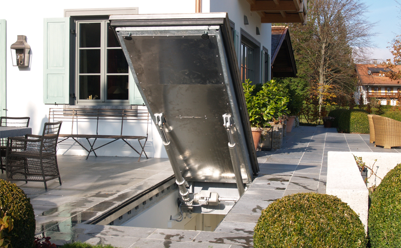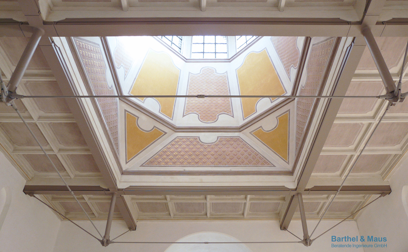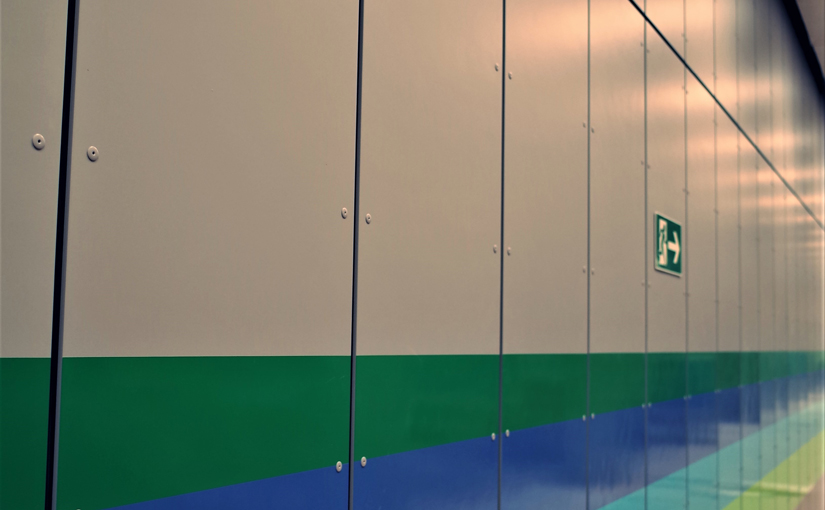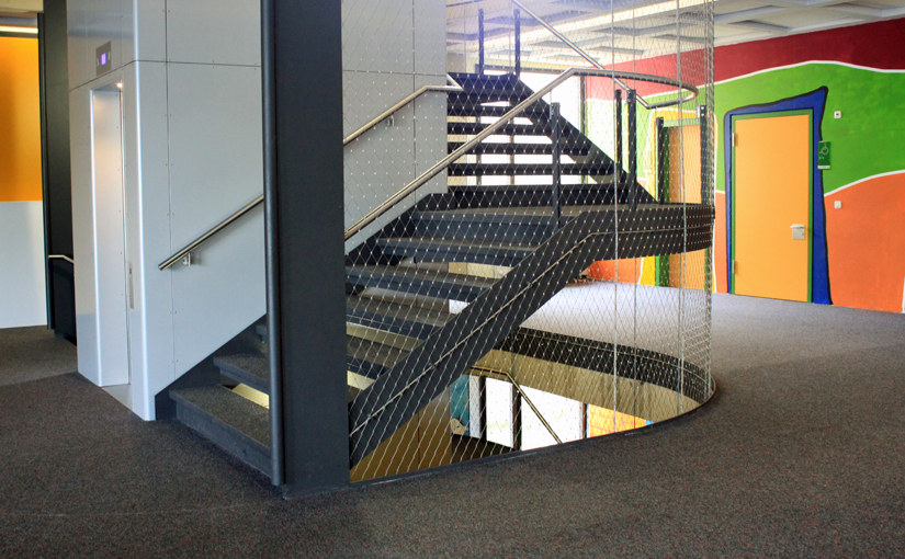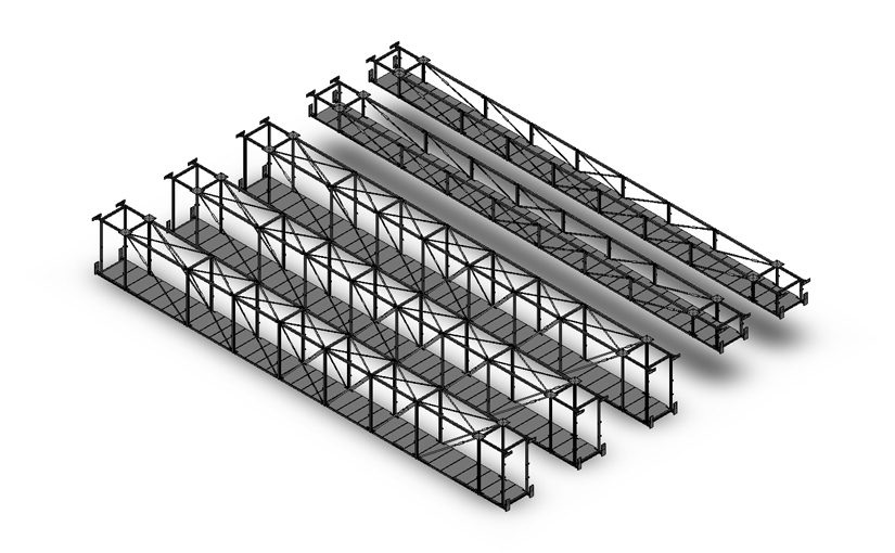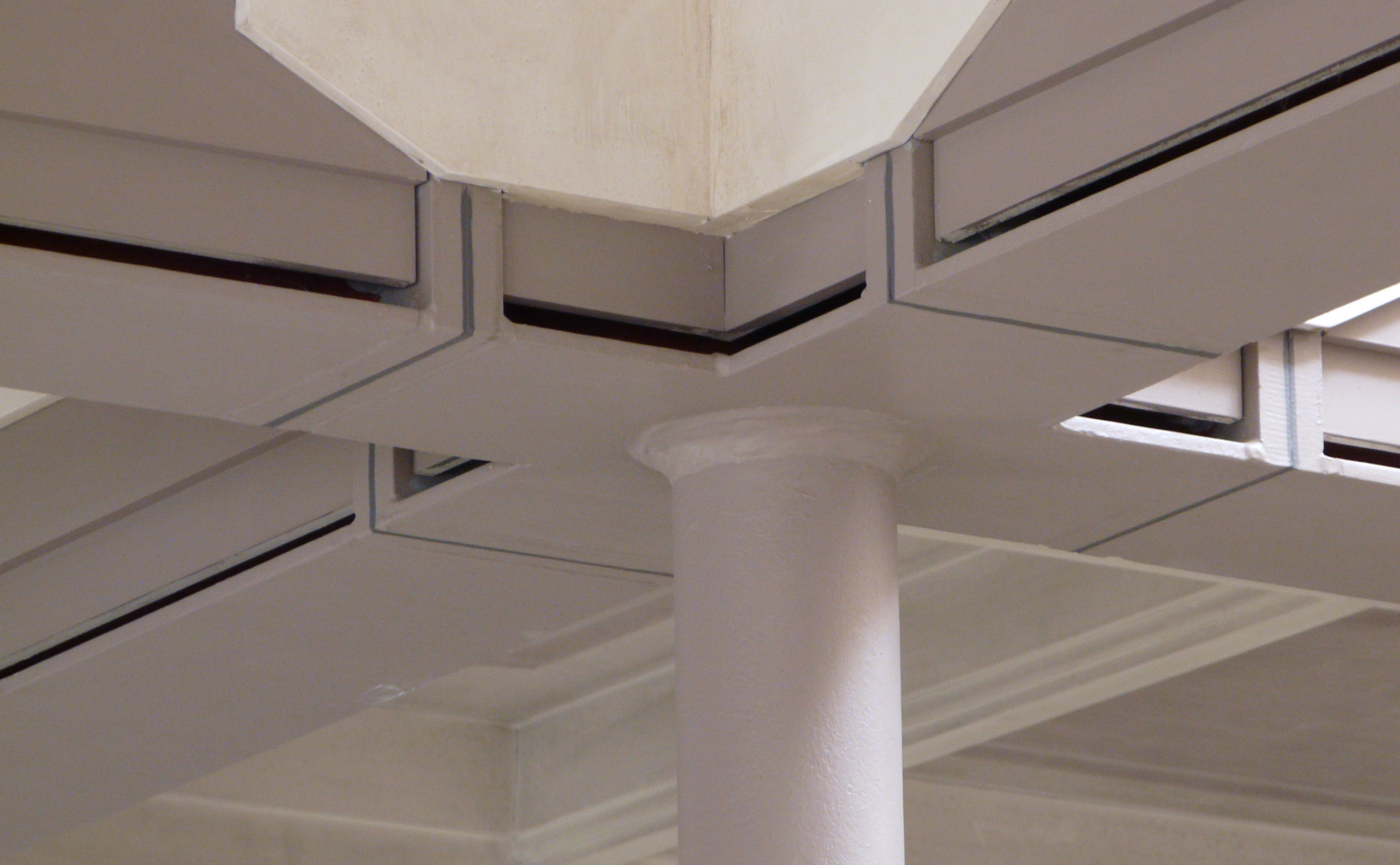 Siebzehn abgehängte Wartungsstege zur Inspektion der Schwimmhallentribünen. Wartungspodeste werden per Hand verfahren. Rauchschürzen fangen Rauch und Brandgase ein. Verkleidung der Schwimmhallenwände.